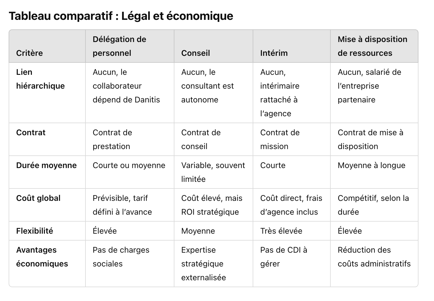 comparatif Délégation, conseil, intérim, mise à disposition de ressources, outsourcing